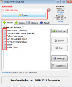 Итак, запускаем программу SaveGame Backup и видим во вкладке Backup полный список наших игровых сохранений. Отмечаем галочками те сохранения, для которых мы хотим сделать резервные копии, нажимаем кнопочку Browse и указываем путь для сохранения файлов (лучше всего сохранять на внешний носитель, как впрочем, и любые другие резервные копии).