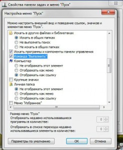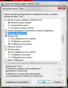 Далее откроется окошко Настройка меню Пуск, в котором, где-то в середине нам нужно найти пункт Команда «Выполнить». Ставим галочку на данном пункте и нажимаем Ок. В предыдущем окне Свойства панели задач и меню «Пуск» нажимаем Применить, а затем Ок.