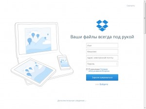 Чтобы зарегистрироваться в Dropbox, необходимо зайти на официальный сайт сервиса, который находится по адресу https://www.dropbox.com и нажать на кнопку Зарегистрироваться. Затем заполняем небольшую анкету и подтверждаем регистрацию. После этого должно начаться автоматическое скачивание программы Dropbox. Если этого по какой-то причине не произошло, просто прокрутите страницу до самого низа и нажмите кнопку Скачать.