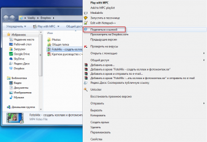 Если вы хотите поделиться папкой или файлами, хранящимися в Dropbox с другими пользователями сети интернет, просто нажмите на этом объекте правой кнопкой мышки и в контекстном меню выберите пункт Поделиться ссылкой. Ссылка на ваш файл или папку будет автоматически скопирована в буфер обмена и вы сможете отправить ее по почте или любым другим удобным для вас способом.