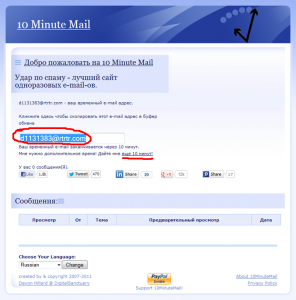 Обойти регистрацию на файлообменных хостингах, или хотя бы избежать указания адреса электронной почты нам увы не удастся. Но, тем не менее, мы можем хотя бы застраховать свой почтовый ящик от вышеупомянутой ситуации со спамом. Для этого достаточно лишь завести временный почтовый ящик. В сети есть один великолепный ресурс – 10minutemail.com, который позволяет завести одноразовый почтовый ящик. Заходим на этот сайт, копируем адрес и регистрируемся на файлообменнике (сайт не закрываем). Вот и все, теперь ждем письмо с подтверждением.