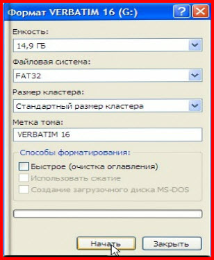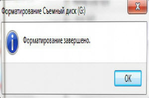 3. Как только вы выбрали систему в которой будете форматировать флешку, не забываем поставить галочку быстрое (очистка оглавления) и нажимаем кнопку начать. После чего у нас появится окошко где написано, что форматирование успешно завершено.