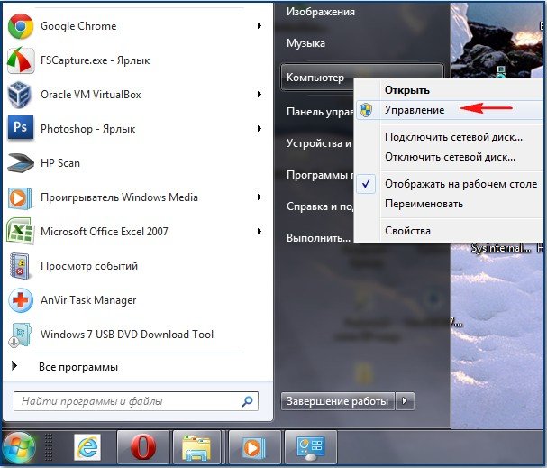 Первым делом нам нужно зайти в управление дисков. Сделать это можно нажав кнопку Пуск, затем правой клавишей мыши клацаем на значек Мой компьютер и выбираем пункт Управление.