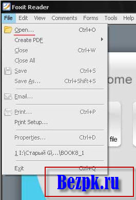 Foxit Reader – очень простая и функциональная программа для просмотра pdf файлов. Еще мне нравится, что она запускается очень быстро, что дает ей большое примущество. Чтобы открыть файл pdf мы запускаем программу и нажимаем на File – Open.