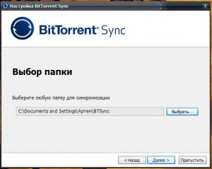 В следующем окне нам предлагают выбрать папку для синхронизации. Выбираем и переходим к следующему пункту.