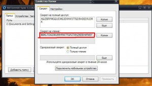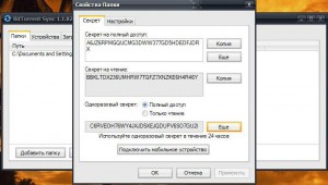 Если вы хотите не выполнять полную синхронизацию с определенным пользователем, а лишь передать ему файлы в одностороннем порядке, можно воспользоваться функцией односторонней синхронизации. Для этого необходимо зайти в свойства папки, с которой вы будете осуществлять передачу файлов, и во вкладке Секрет в разделе Секрет на чтение при помощи кнопки Копия скопировать секретный код, а затем передать его другому пользователю. Тот должен добавить новую папку и при ее создании в поле Секрет вставить переданный вами секретный код.