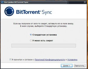 Как вы возможно уже догадались, для передачи файлов и синхронизации необходимо чтобы программа BitTorrent Sync была инсталлирована на всех компьютерах, которые будут участвовать в процессе. Процедура установки будет такая же, но есть один важный момент – в окне выбора типа установки необходимо будет указать пункт У меня есть секрет и ввести секретный код, полученный ранее.
