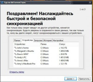 Далее нам предлагается провести «Тур по BitTorrent Sync» для того, чтобы вкратце ознакомиться с программой. Если не хотите, просто нажмите Пропустить.