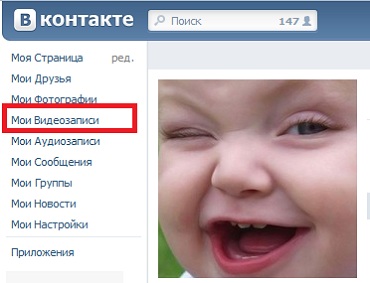 Теперь мы будем рассматривать как переворачивать видео при помощи Вконтакте. Если вы не зарегистрированы и не пользователь этой социальной сети,то просто пройдитете легчайшую регистрацию в сервисе вконтакте, воспользуйтесь подсказками. Сразу предупреждаю,что проделать это возможно далеко не со всеми подряд видео, которые находятся в этой соц сети. Но, все таки,перевернуть видео вконтакте можно большую часть находящихся там видеофайлов.Для начала заходим на свою страниwe пользователя Вконтакте и выбираем раздел видеозаписи,который находится с левого края: