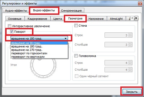 Итак,мы открываем видео при помощи VLC проигрывателя. Сверху в окошке выбераем Инструменты и нажимаем Эффекты и фильтры: В открывшемся вам окошке Регулировки и эффекты выбераем раздел Видео-эффекты и нажимаем на вкладку Геометрия. Во вкладке Геометрия поставим галочку напротив Поворот и во графе вращение на.. выбераем нужный нам угол. После окончания настройки нажимаем Закрыть.