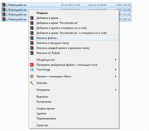 Полученные архивы можно будет записать на два или больше накопителей и донести до места назначения, то есть до другого компьютера. Хорошо, а как теперь слепить эти части обратно, чтобы снова получился тот самый файл, который был вначале? Склеить файл обратно совсем несложно. Помещаете полученные архивы в какую-нибудь одну папку на компьютере, выделяете их, нажимаете правой кнопкой мышки и выбираете из контекстного меню пункт Извлечь файлы.