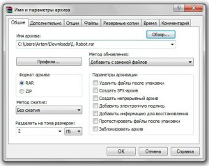 Далее появится окно программы Winrar, в нем нам нужно выбрать кнопкой Обзор место, куда нужно будет сохранить полученные архивы, определить метод сжатия и указать размер томов, на которые программа поделит файл. Учтите, что размер тома по умолчанию стоит в байтах, однако вы можете выбрать и другую единицу измерения. Что касается метода сжатия, то выбирать его следует, исходя из типа файла – если вы решили разделить фильм или образ игры, то лучше выбирайте метод архивации Без сжатия.