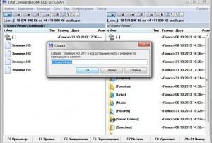 Ну а когда придет время объединить все части файла, поместите их в одну папку, откройте Total Commander, выделите первый по списку файл (в его строке Тип значится число 001), затем перейдите в меню Файлы и нажмите на пункт Собрать файлы.