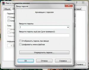 Далее придумываем и вводим пароль для архива. Если хотите, чтобы другие пользователи не только не могли открыть файлы, но и вообще зайти в папку, поставьте галочку на пункте Шифровать имена файлов.