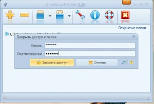 Чтобы закрыть доступ к какой-либо папке на компьютере, нужно зайти в программу Anvide Lock Folder, с помощью кнопки «Плюс» добавить папку в окно программы, а затем, выделив папку, нажать на кнопку замка (или F5), чтобы установить пароль. После введения пароля программа также предоставляет возможность оставить подсказку к паролю, на тот случай если вы его забудете.