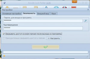 Кнопки со знаками «Плюс» и «Минус» служат для добавления папок в список программ, кнопки с символом замка – для закрытия и открытия доступа к добавленным папкам. В целях безопасности будет разумно в первую очередь заблокировать доступ к самой программе, чтобы это сделать зайдите в настройки, перейдите во вкладку Безопасность и введите пароль для входа в Anvide Lock Folder.