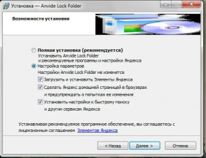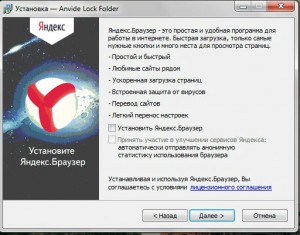 В отличие от утилиты DirLock, программа Anvide Lock Folder во время установки пытается навязать нам инсталляцию столь «любимых» нами элементов Яндекса, так что будьте внимательны.