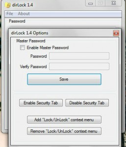 После установки и запуска программы стоит произвести некоторые настройки. Переходим в меню File, выбираем Options и здесь мы можем задать единый универсальный пароль для всех папок, которые будем блокировать (для этого поставьте галочку на пункте Enable Master Password), а также добавить пункт приложения в контекстное меню (нужно нажать кнопкуAdd”Lock/UnLock” context menu).