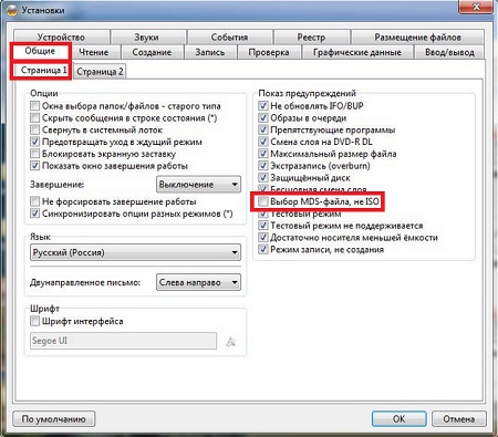 В открывшемся окне во вкладке «Общие» → «Страница 1» уберите галочку напротив «Выбор MDS-файла, не ISO».