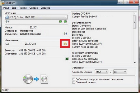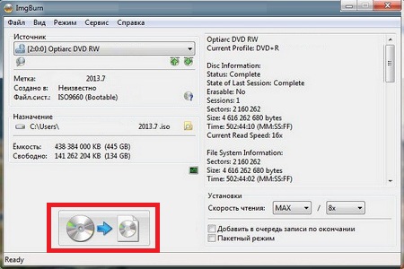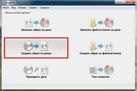 В главном окне выбираем (создать образ диска). Кроме этого можно выбрать Создать образ из файлов и папок, это если вы хотите создать образ из файлов которые находятся у вас на компьютере.