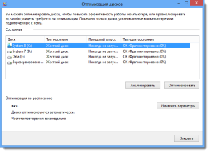 В Windows 8 имеется встроенный стандартный дефрагментатор под названием Optimize Drives. По умолчанию данная программа автоматически выполняет дефрагментацию по расписанию один раз в неделю, что весьма неплохо. Однако после операций по перемещению большого количества файлов жесткий диск может быть сильно фрагментирован, что в свою очередь приведет к замедлению доступа к файлам на нем. В таком случае можно выполнить дефрагментацию вручную. Для доступа к Optimize Drives нажмите кнопку Win и в строке поиска наберите: дефрагментация. Перед началом дефрагментации желательно провести предварительный анализ, на случай если файловая система в данный момент не нуждается в дефрагментации.
