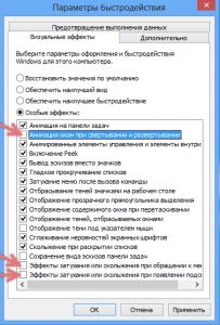 Хоть новая операционная система и имеет дизайн в стиле минимализма, различных анимационных эффектов и прочих эстетических примочек в ней совсем не убавилось. Для улучшения быстродействия некоторые из этих эффектов можно отключить. Нажмите клавишу Win, наберите в строке поиска: параметры быстродействия, и нажмите Enter. В окне настроек параметров перейдите на вкладку Визуальные эффекты и снимите галочки с таких пунктов, как «Анимация окон», «Эффекты затухания» и тому подобных. Данное действие поможет высвободить полезный объем оперативной памяти для более важных задач.