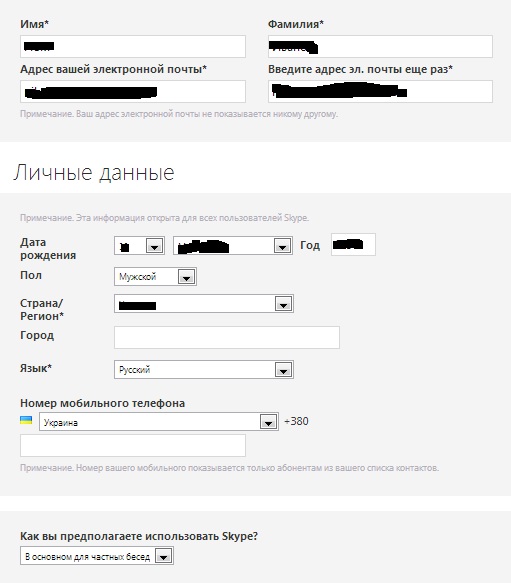 Вам открывается страничка регистрации в Скайпе (Skype). Я бы посоветовал ввести вам ваши реальные анкетные данные, т.к по ним- Вас и будут ваши знакомые со всего мира. Может например, кто-то забыл вашу фамилию, но точно знает имя, дату рождения и допустим город, где вы проживаете или наоборот.