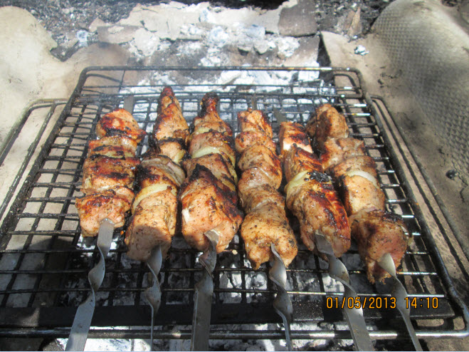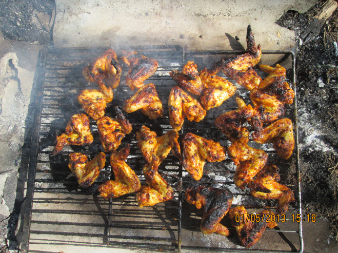 Как только угли прогорели я начал наживлять мясо на шампуры, всегда люблю возиться с мясом. Особенно люблю куриные крылья, они мне нравятся даже больше чем свининая шея. Ну, давайте же посмотрим что у нас получилось с нашим мясом.