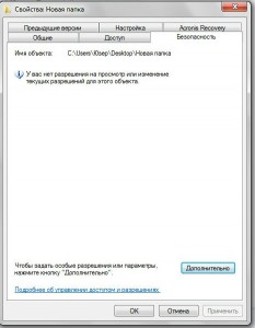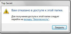Теперь проверим, правильно ли мы все сделали. Выходим из системы (Win+L), заходим в нее под другим именем пользователя и пробуем зайти в нашу «засекреченную» папку. Должно появиться вот такое предупреждение:
