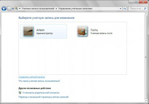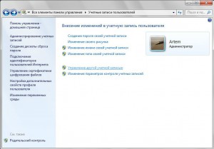 Первым делом давайте создадим учетную запись, из под которой мы будем работать с нашими «секретными» документами и файлами. Открываем меню Пуск, заходим в Панель управления и выбираем пункт Учетные записи пользователей.