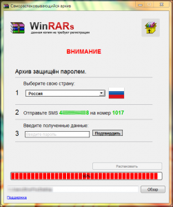 Схема данного обмана немного похожа на предыдущую. Мошенник выкладывает на сайте-файлообменнике будто бы архив с контентом, а на самом деле — программу, замаскированную под самораспаковывающийся архив. Пользователь скачивает этот архив, но при попытке его распаковать, получает уведомление о необходимости отправки СМС-сообщения для получения доступа. Ну а дальше все понятно – со счета пользователя снимается определенная сумма денег, а архив в большинстве случаев не содержит никакой полезной информации.