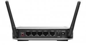 Cisco RV120W-E-G5 выполнен в эргономичном темно-сером корпусе, который отлично впишется в обстановку небольшого офиса. Большая часть площади маршрутизатора состоит из решетки вентиляции, на передней панели корпуса находятся индикаторы, подсвеченные мягкой зеленоватой подсветкой: питание, WAN, Wi-Fi, LAN-подключения. На задней панели, помимо двух мощных всенаправленных антенн, можно обнаружить четырехпортовый коммутатор Fast Ethernet, кнопку возврата к заводским установкам, кнопку выключения и разъем для кабеля питания.