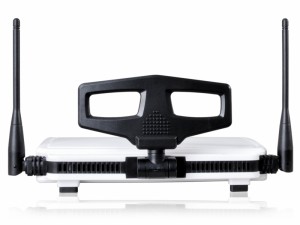 Внешне маршрутизатор представляет собой нечто совершенно необыкновенное, разрабатывая Tenda W330R дизайнеры явно не постеснялись проявить свою фантазию. Особенно интересно смотрится роутер в вертикальном положении, напоминая неуклюжего пластмассового робота. Если присмотреться, то понимаешь, что такое впечатление создается в первую очередь благодаря необычной форме средней антенны Wi-Fi. В общем, данный роутер обязательно будет оценен по достоинству, как любителями футуристических вещей, так и просто людьми с хорошим чувством юмора. Передняя и задняя панели корпуса имеют белый глянцевый цвет, а вот середина и три внешние антенны окрашены в черный. Антенны кстати несъемные и не могут быть заменены, что, впрочем, не является большим недостатком для модели среднего класса. Сетевые разъемы в роутере расположены на правом торце и довольно удобны в использовании, при условии, что роутер установлен вертикально.