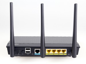 На заднем торце роутера находятся стандартные разъемы LAN и WAN, пара разъемов USB, кнопка выключения, кнопка сброса настроек и кнопка WPS. В целом вся конструкция и элементы управления вполне стандартны для роутеров фирмы Asus. Также на задней панели прописались три разъема для подключения внешних антенн Wi-Fi, сами антенны идут в комплекте и отличаются интересным и стильным дизайном.