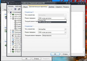 Нажимаем правой кнопкой мышки по первичному каналу, выбираем в контекстном меню пункт Свойства и в раскрывшемся окне переходим на вкладку Дополнительные параметры. На неактивных каналах в пункте Текущий режим передачи вы увидите надпись Неприменимо, а на подключенных каналах будет стоять режим Ультра DMA или PIO. Если там у вас стоит режим PIO, то в пункте Режим передачи выставляем параметр DMA, если доступно.