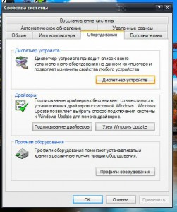 Итак, заходим в диспетчер устройств. Для этого нажимаем правой кнопкой мыши по значку Мой компьютер, выбираем пункт Свойства и идем во вкладку Оборудование.
