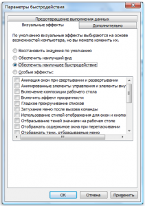 Операционная система Windows 7 отличается привлекательным интерфейсом и обилием всяческих визуальных эффектов, таких как прозрачность, плавная анимация и так далее. Однако когда нужно добиться максимальной производительности системы, приходится идти на компромисс между внешней красотой и скоростью работы. Чтобы выполнить настройку визуальных эффектов, зайдите в меню Пуск>Панель управления>Система и ее обслуживание>Средства и счетчики производительности>Настройка визуальных эффектов. В открывшемся окне щелкните на вкладке Визуальные эффекты. Здесь вы можете выбирать: отключить все эффекты, нажав на кнопку «Обеспечить наилучшее быстродействие» или же самому выбирать, какие именно эффекты отключить, а какие оставить как есть. Первыми кандидатами на отключение можно назвать такие эффекты, как гладкое прокручивание списков, анимация окон и тому подобное, поскольку они, как говорится, погоды совершенно не делают. В то же время использование стилей отображения для окон и кнопок стоит отключать в последнюю очередь, поскольку это сильно изменит внешний вид вашего рабочего стола и оформления папок.
