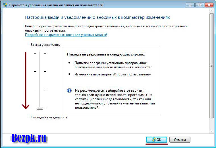 Далее делаем так как я показываю на картинке. Отпускаем бегунок в нижнее положение и жмем ОК. После этого выскочит табличка с предупреждением о том, что будет отключен UAC в windows 7. И после у вас уже не будет вылазить окно с (настройка выдачи уведомлений windows 7).