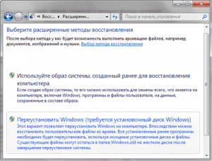 В следующем окне система предложит нам два варианта восстановления, нас интересует второй – восстановление с использованием установочного диска Windows.