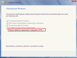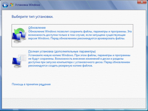 После того, как все обновления будут установлены, компьютер снова перезагрузится и начнется процесс установки. После принятия лицензионного соглашения должно появиться окно, в котором нам нужно будет выбрать первый вариант установки – обновление Windows с сохранением параметров.