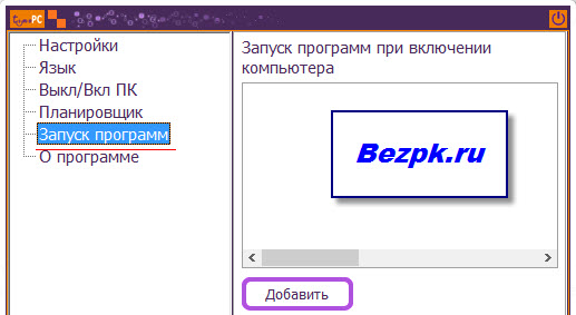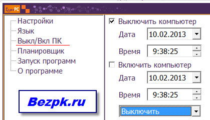 Как видно на картинке есть пункты запуска программ, а так же включения и выключения компьютера. В основном все так же как и в предыдущей программе – заходите в раздеу Выкл/Вкл ПК, вводите дату и время включения или выключения компьютера.
