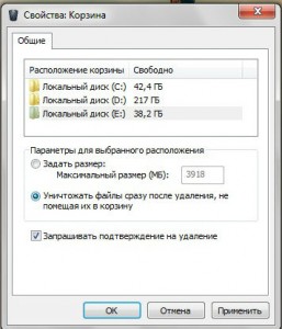 Нажимаем на значке корзины правой кнопкой мышки и выбираем в контекстном меню пункт Свойства. Затем ставим галочку на пункте Уничтожать файлы сразу после удаления, не помещая их в корзину. Повторяем для всех логических дисков и нажимаем Применить.