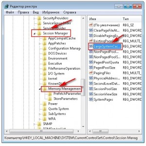 Далее переходим по ветке Session Manager, затем идем в Memory Management и наконец ищем в этом пункте параметр LargeSystenCache, находящийся в правой части окна редактора реестра.